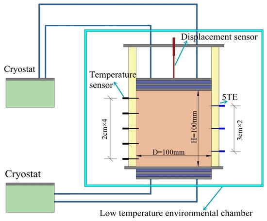 The initial moisture content of the silty clay was 20%. The test sample was a cylindrical soil column with a diameter of 10 cm and a height of 10 cm, and its dry density was 1.57 g/cm3. The initial temperature of the silty clay was T0 = 1 °C, and the bottom temperature of the soil column was maintained at 1.0 °C. At the beginning of the experiment, the top temperature of the soil column was controlled at −3.0 °C.