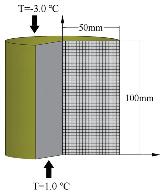 The computational model for unidirectional freezing of the soil column was simplified as a 2D axisymmetric numerical model with a 1/2 section along the centreline of the top and bottom surfaces of the soil column. The model dimensions were 10 cm in height and 5 cm in width, as shown in Figure 3. The initial temperature was T0 = 1 °C, the temperature at the top of the model was controlled at −3.0 °C, the temperature at the bottom was controlled at 1.0 °C, and the left and right ends were zero flux boundaries [15,31]. The initial volumetric water content of the test soil was 0.30. The computational duration was 100 h, and the computational steps were 0.1 h. The hydraulic, thermodynamic, and mechanical parameters used in the computational model are shown in Table 1 [15,24,32,33].