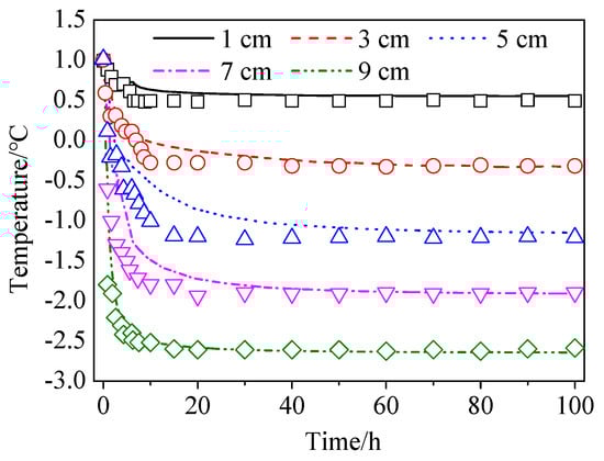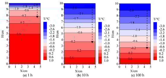 Figure 7 shows the distribution of the temperature field of the silty clay at various times during the freezing, from which it can be seen that the freezing front of the soil gradually pushed downward with time, and the freezing depth of the specimen reached approximately 7.5 cm at 100 h; that meant the soil body with a height greater than 2.5 cm becomes frozen soil. Because the left and right boundaries of the model were adiabatic, there was no horizontal temperature gradient in the soil body, and the temperature remained constant horizontally.