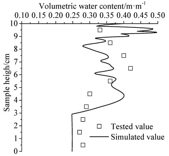Figure 5 compares the measured and simulated values of the volumetric moisture content of the silty clay after freezing for 100 h. It can be seen that, except for some differences between the simulated and measured values near the upper boundary due to multiple reasons such as the high nonlinearity of the computational model, the simulation does not consider the freezing rate, and there exists ice segregation; the overall numerical simulation more accurately reflected the water migration phenomenon during the unidirectional freezing process of the silty clay. The measured and simulated values of the average volumetric moisture content in the frozen zone were 0.35 and 0.33, respectively, and the measured and simulated values of the average volumetric moisture content in the unfrozen zone were 0.28 and 0.25, respectively. The simulated and measured values in the frozen and unfrozen zones were closely aligned.