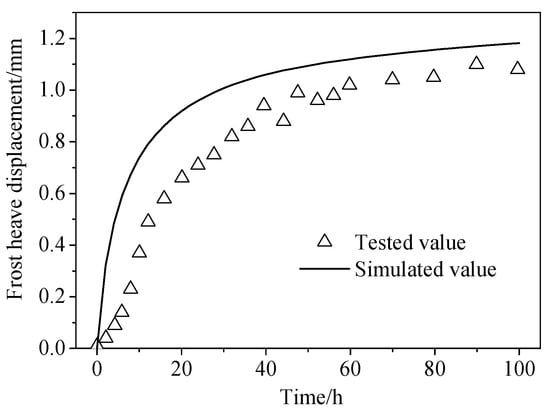 Figure 13 shows the distribution of frost heave displacement during the unidirectional freezing process of the silty clay. The figure shows that the frost heave of the soil column gradually increased with the increase in freezing duration in the initial stage of the experiment. The frost heave displacement in the first hour of freezing was small; the frost heave displacement on the top surface of the soil column was 0.3 mm. After freezing for 10 h, the ice content increased and gradually filled the unsaturated pores, and the frost heave displacement on the top surface of the soil column reached 0.7 mm. After freezing for 100 h, the frost heave displacement on the top surface of the soil column reached 1.2 mm, and the maximum measured frost heave displacement was 1.1 mm. The relative error between the simulated value and the measured value was 9%.