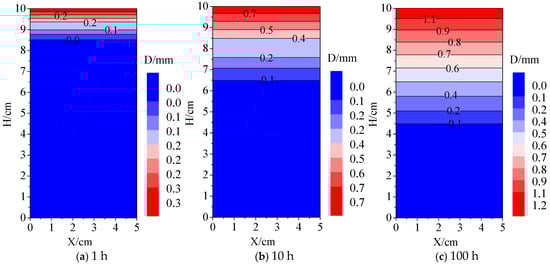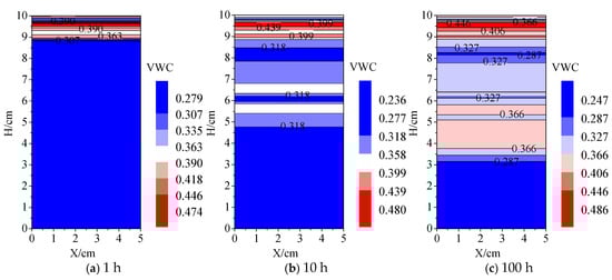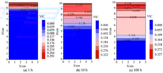 Figure 8 shows the distribution of the volumetric water content (the sum of unfrozen water and ice content) of the silty clay during unidirectional freezing at various times. The figure shows clearly that the moisture field was redistributed during the unidirectional freezing of the soil column. From the distribution cloud diagrams of the volumetric water content of the specimens at 1 h, 10 h, and 100 h, it can be seen that as the freezing process developed, the water content in the frozen zone of the specimens gradually increased, whereas that in the unfrozen zone gradually decreased. That was due to the migration of liquid water and water vapor in the unfrozen soil to the freezing front driven by the temperature gradient, increasing the water content of the frozen zone. In contrast, the bottom of the test soil column was closed without water supply, resulting in a decrease in the water content of the unfrozen zone.