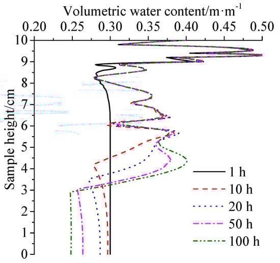 Figure 9 shows the distribution curves of volumetric water content along the height of the soil column for the 1st, 10th, 20th, 50th, and 100th h during the freezing process of the pulverized clay soil. The volumetric water content of the soil in the freezing zone gradually increased as the duration increased from 1 h to 100 h, and the volumetric water content of the soil in the unfrozen zone decreased, so the migration of the water to the freezing zone in the freezing process can be clearly seen.