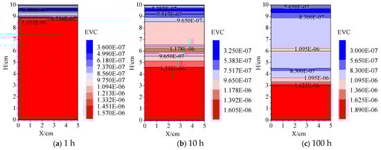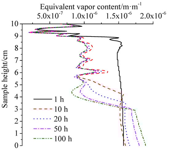 Figure 11 shows the distribution of the equivalent vapor content of silty clay at various times during the freezing process. The figure shows that at the beginning of the test, the temperature at the bottom of the soil column was higher, so its equivalent vapor content was larger. The equivalent vapor content near the freezing front was lower during the freezing process, which was due mainly to the migration of liquid water and vapor from the unfrozen zone to the freezing front, where they accumulated, resulting in a reduction in the unsaturated pore space at that height, and thus the equivalent vapor content at that height was lower. Comparing the equivalent vapor content at various times during the freezing process, it can be seen that the equivalent vapor content at the same height in the unfrozen zone gradually increased, and the equivalent vapor contents in the unfrozen zone at the 1st, 10th, and 100th h were approximately 1.368 × 10−6, 1.392 × 10−6, and 1.625 × 10−6, respectively. The equivalent vapor content in the freezing zone decreased with increasing freezing duration. That phenomenon was due mainly to the migration of liquid water and vapor to the freezing zone under the action of the temperature gradient, resulting in an increase in the space occupied by the vapor in the unfrozen zone. The equivalent vapor content of the unfrozen zone increased, the space occupied by the vapor in the freezing zone decreased, and the equivalent vapor content of the frozen zone decreased. That is, the equivalent vapor content in the unsaturated soil body was affected by the temperature and moisture of the soil body.