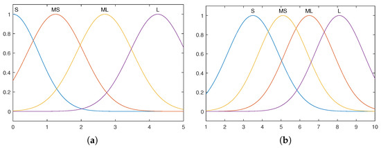 Figure 1. Membership functions of the FLS (S, MS, ML, and L represent small, medium-small, medium-large, and large, respectively): (a) input membership function; (b) output membership function. - 2.
