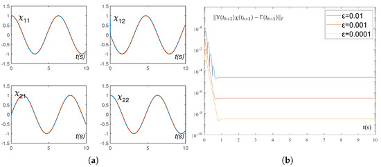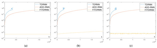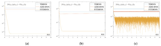 This subsection applies the FITDRNN model (12) to solve the following discrete time-varying matrix problem. The experiment utilized sample data derived from the mathematical essence of discrete time-varying matrix problems. The coefficient matrices and followed typical dynamic evolution forms in time-varying system theory [2,23], defined as