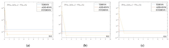 Under noise-free conditions, the FITDRNN model (12) was applied to solve the above-mentioned discrete time-varying matrix problem. The experimental results are clearly demonstrated in Figure 2 and Figure 3. Figure 2a presents the trajectories of the theoretical solution and the state solution : The theoretical solution is marked by red dashed lines, while the state solution is represented by blue dashed lines. It can be observed that the state solution converged rapidly to the theoretical solution with random initial value. To further analyze how the sampling gap influences FITDRNN model (12) performance, Figure 2b illustrates the variation of the residual error of the FITDRNN model (12) under different values of . The experimental data show that when changed from 0.01 to 0.001, the residual error correspondingly varied from to . This demonstrates that the residual error of the FITDRNN model (12) varies in the form of , consistent with the theoretical analysis in Section 4. Figure 3 compares the residual errors of the TDRNN (3), ADD-RNN (4), and FITDRNN (12) models across varying values. The results demonstrate significantly smaller residual errors for the FITDRNN model (12) compared to both TDRNN (3) and ADD-RNN (4) across all tested values, confirming its superior convergence accuracy.