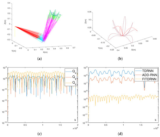 In the absence of noise, the experimental results are presented in Figure 5. Figure 5a displays the trajectory of the robotic arm during the tracking process, while Figure 5b depicts the actual and desired trajectories of the robot end-effector. It can be clearly observed that the trajectory presents an approximately rotationally symmetric feature around the center in three-dimensional space, and the actual trajectory aligns remarkably well with the desired trajectory, which indicates that the FITDRNN model (12) can successfully accomplish the robotic arm trajectory tracking task. Meanwhile, Figure 5c shows the error between the actual and desired trajectories of the X, Y, and Z axes of the robotic arm when it performed the tracking task. Figure 5d presents the error comparison among the TDRNN model (3), ADD-RNN model (4), and FITDRNN model (12). It is evident that the residual error of the TDRNN model (3) is , the ADD-RNN model (4) is , and the FITDRNN model (12) is , with the error of the FITDRNN model (12) being significantly lower than that of the TDRNN model (3) and ADD-RNN model (4).