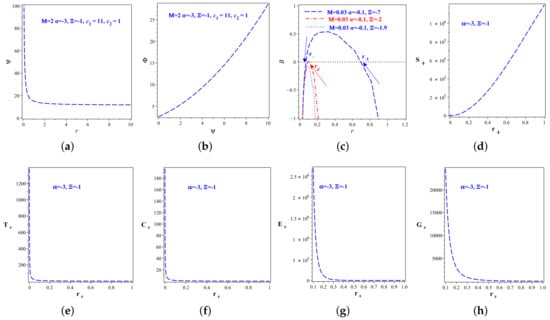 The behavior of the quasi-local energy is depicted in Figure 1g, illustrating a positive value for . The Gibb’s free energy is defined as follows, as per [102,113]: