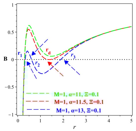 In this section we discuss if the spacetime (30) can create a multi-horizon or not. As we discussed in Section 5, we can reproduce two horizons when we give fixed values for the gravitational mass and the dimensionless parameter and solve for . From this calculation we show that if we can create two horizons, if then the two horizons coincide, and if then the naked singularity region appears. Now we follow another procedure by assuming certain values of M and and solving for the dimensionless parameter . In this case, as Figure 3 shows, if we can get three horizons, if two of these horizons coincide, and for we only have one horizon. It is worth noting that this case, multi-horizon, differs from the first case, two horizons, in that we have only obtained one critical value for . It is important to stress that if we use the numerical values of the multi-horizon spacetime, i.e., , we can create similar behavior for the thermodynamic quantities presented in Section 5.