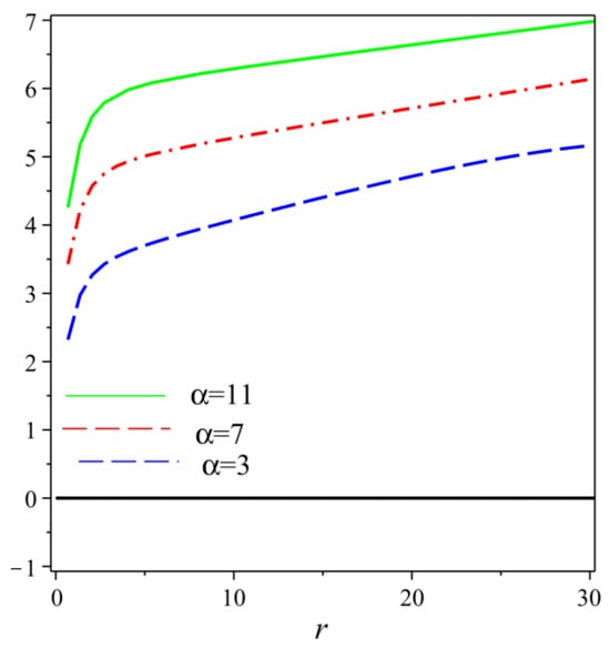 This form does not align with the Schwarzschild spacetime, primarily due to the influence of the parameter . We hypothesize that this parameter is linked to the higher-order curvature terms within the framework and is also affected by the contributions from . It can be readily verified that setting allows for a seamless transition back to the Schwarzschild spacetime, as discussed in [99]. Equation (28) illustrates that for a non-zero value of the parameter , the Ricci scalar assumes a non-trivial value. This is attributed to the contributions from higher-order curvature terms and the Gauss–Bonnet term. Conversely, when is set to zero, the Ricci scalar simplifies to a trivial value, aligning with the predictions for a BH in GR. The asymptotic behavior of , is given by