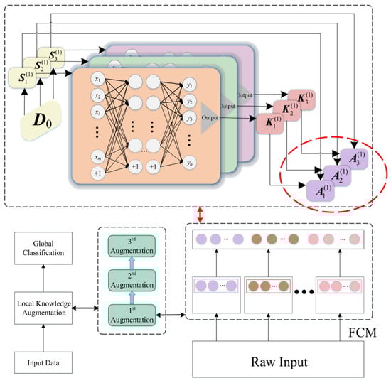 | Require: Input feature matrix and corresponding label T, the number of sub-models in each level L, the number of hidden units, the epoch, and batchsize Ensure: Fused decision output. 1: Initialization: Use FCM algorithm to divide total set into multiple regional subsets 2: Parallel training of sub-models: Then call Algorithm 1 to train several DNNs in parallel with these subsets, and the classification label can be determined. 3: Creation of augmented data: Consider the actual classification label as the created knowledge and concatenate this new feature with previous input. The feature fusion is formed as . Collect all local augmented data, we can derive new total dataset . K denotes the new feature learned by the architecture, A represents the combined features integrating both the new feature and the previous input, and D refers to the new features aggregated from all subsets of regions. 4: Repeat the process similar to the first local knowledge augmentation. The augmented global dataset can be written as . 5: Repeat the process similar to the first local knowledge augmentation. So the final global dataset can be expressed by . 6: Parallel learning of sub-models: Call Algorithm 1 on global dataset in parallel to achieve individual result . 7: Final decision: According to majority vote, determine the class of testing sample. |