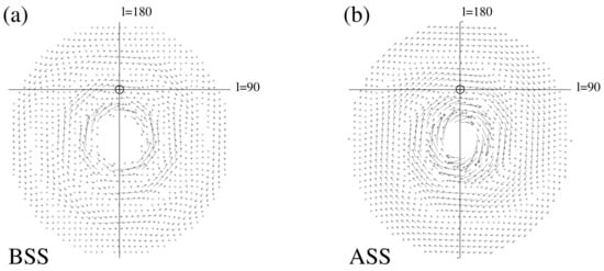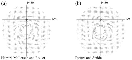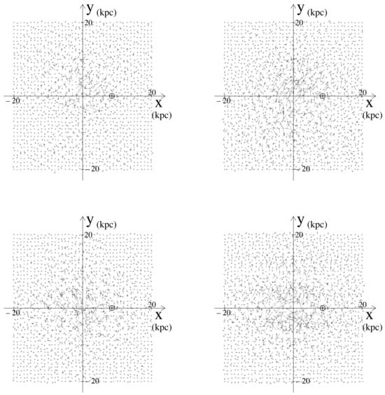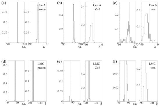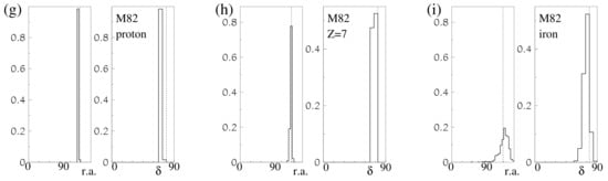 In order to determine the extent of the observed changes in the directions of incoming particles from extragalactic sources, we conducted calculations involving the emission of particles with energy of  eV from the sources under study towards the Solar System. As these particles entered the magnetic fields of the Galaxy, they changed direction, making it extremely unlikely that they would hit the Solar System. They could leave the Galaxy without ever approaching the observer’s position. We checked the closest distance at which a particle would pass the Solar System in each case, recording the angle of arrival if the distance was less than 500 pc. In each such case, we determined the position of the point on the celestial sphere indicated by the particle velocity vector at the moment it passed the Solar System at its closest point. We considered this direction to be a good approximation of the direction of arrival of the ultra-high-energy cosmic ray. The value of 500 pc was chosen arbitrarily. Using a smaller value would not affect the deviation results, but it certainly affects the number of cases in which particles pass very close to the observation point. The fraction of particles hitting such ‘blurred area’ of the Solar System is shown in the tables below in the last columns and is marked as ‘hits’.