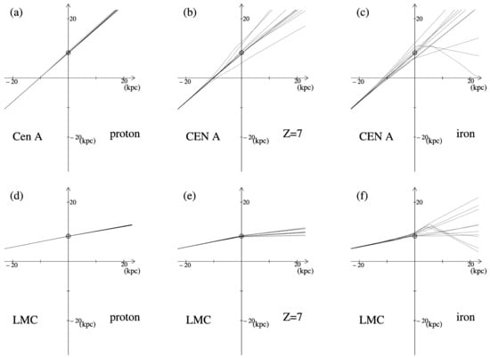 Example trajectories for protons, the CNO group of nuclei (Z = 7) and iron, in the case of emission from Cen A, LMC and M82 and the regular magnetic field of Ref. [