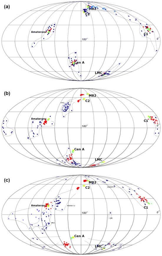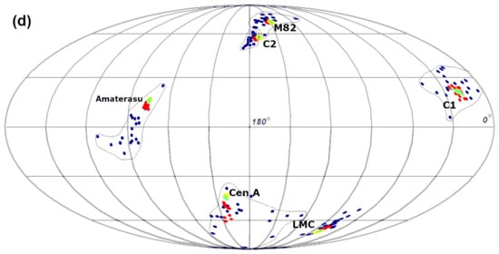 1]. Whereas an attempt could be made to attribute the AGASA triplets to astronomical objects (C1—Mrk 359, C2 to the galaxy NGC 3642 (quite close, 8.4 Mpc)) or the distant Mrk 40 or Mrk 171, no visible relatively close object can be attributed to Amaterasu.