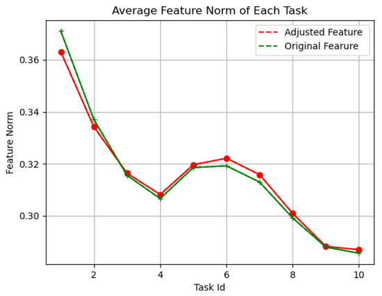 Figure 5 illustrates the impact of our feature adjustment mechanism. Prior to adjustment, the feature norms of earlier tasks are significantly larger than those of later tasks, indicating an imbalance. Our feature adjustment (F.A.) mechanism reduces the norms of earlier tasks while increasing those of later tasks, resulting in a more balanced representation across all tasks and effectively mitigating the imbalance.
