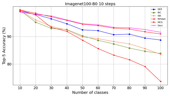 Comparison of Top-5 accuracy at each step with other methods on ImageNet100-B0S10.