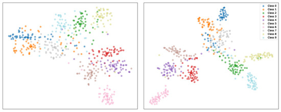 As shown in Figure 7, we use t-SNE [44] to visualize the feature distributions. The left plot presents the results of the baseline DER method, where features of old task classes appear scattered and less compact, indicating weaker retention of old task representations. In contrast, the right plot highlights the results of our proposed method, where features form more distinct clusters, demonstrating the better preservation of old task boundaries and improved feature separability.
