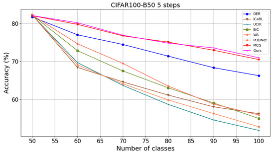 Comparison of accuracy at each step with other methods on CIFAR100-B50S5.