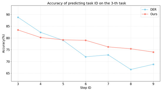 Predicting task ID. Model performance in predicting task ID on the third task with different auxiliary loss after training each task on ImageNet100-B0 from step three to the last step. We compare the accuracy of the contrastive auxiliary losses and DER. “Ours” refers to training the model using CEC and CFC loss. The abscissa represents the step of current task.