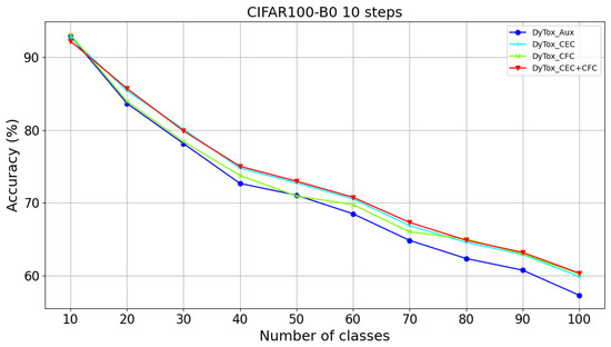 We compared the accuracy of DyTox at each step using different loss functions on CIFAR-100B0S10, as illustrated in Figure 11. During the learning of the first 10 classes, the original DyTox method (using auxiliary loss) demonstrates accuracy comparable to our methods. However, as more tasks are learned, our methods show a clear accuracy advantage. The DyTox with CFC method maintains similar accuracy to the original DyTox in the early stages, but outperforms it as the number of tasks increases. CEC loss, in contrast, rapidly demonstrates a marked improvement in accuracy right from the early stages.