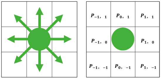 When signage appears within a passenger’s field of view, the passenger is not only attracted by it, but also able to interact with it to obtain directional guidance. Upon perceiving this guidance, passengers tend to move in the direction indicated by the signage. As shown in Figure 4a, when signage pointing to the right enters the passenger’s visual field, the directional guidance factor increases the probability of selecting neighborhood cells aligned with the signage’s direction, thereby enhancing the likelihood of movement along the indicated path. On the contrary, as shown in Figure 4b, when signage is not visible, no visual interaction occurs, and the direction guidance factor exerts no influence on the passenger’s movement [40]. Therefore, the direction guidance factor effectively captures behavioral differences in movement based on the presence or absence of signage within the field of view. The computation of the direction guidance factor is defined as follows: