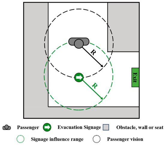 Evacuation is a dynamic and high-stress process, particularly in unfamiliar environments where passengers tend to rely on signage to guide their movement. In such contexts, effective information interaction between signage and passengers plays a critical role. The signage’s influence is modeled as a circular field centered on the signage itself, with its radius defining the range within which it can affect passenger behavior. Similarly, each passenger has a circular visual field, and meaningful interaction can occur only when the signage falls within this field of vision.