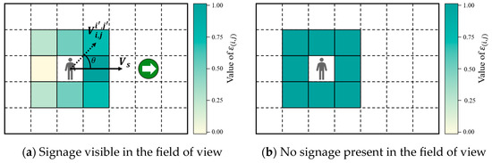 where is the direction guidance factor, ranging from 0 to 1; is the passenger’s visual radius; and denotes the distance to the nearest signage. The vector represents the direction from the current cell to a neighboring cell, and is a unit vector indicating the signage’s direction. For instance, if the signage points to the right, then . The angle formed between these vectors determines the effectiveness of directional alignment, as depicted in Figure 4a.