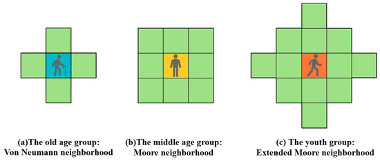 To simulate group-specific evacuation behaviors more accurately, this study assigns different neighborhood types based on mobility characteristics. According to MSC.1/Circ.1533 [28], the maximum walking speeds for different age groups are defined as follows: 1.1–1.6 m/s for young adults, 0.7–1.5 m/s for middle-aged individuals, and 0.6–1.2 m/s for the elderly. In this model, the lower bound of each speed range is adopted to reflect the worst-case mobility conditions during emergency evacuations.