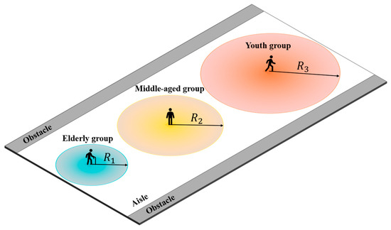 Additionally, visual perception is also age-sensitive. As individuals age, their field of vision narrows. Thus, the elderly possess the smallest visual range, followed by the middle-aged group, with the youth exhibiting the broadest range. To quantify this, the study assigns circular visual fields with age-specific radii, as illustrated in Figure 6 [42].