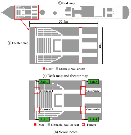 As shown in Figure 7a, the theater covers approximately , with a length of , and a width of . The layout of the theater is symmetrical. Figure 7b marks key locations, including four exits (Exit 1–Exit 4) and four crossroads (Crossroad 1–Crossroad 4).