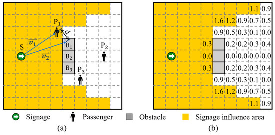 Step (3) Determine the visibility and compute the attraction field. First, calculate the distance from each neighborhood () to the nearest signage. Then, compare with the passenger’s field of vision radius If the signage is within the visual range (), the signage attraction field is defined as: