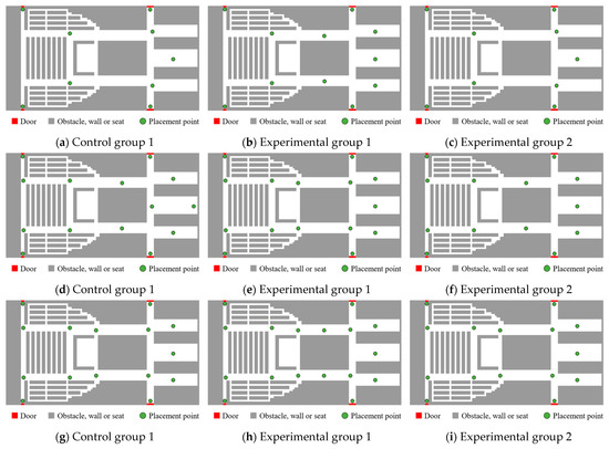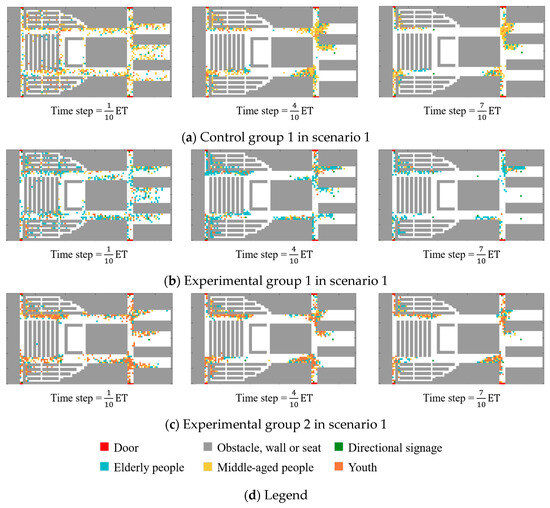 To investigate the effect of the demographic composition on evacuation dynamics, three groups were designed with different age distributions: Control group 1, Experimental group 1, and Experimental group 2. Their performance in scenario 1 was analyzed at three critical time points—, , and —to capture evolving congestion patterns (Figure 17).