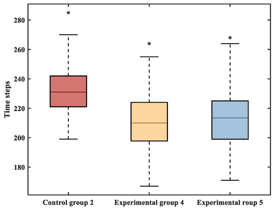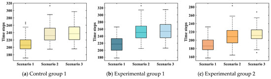 Evacuation time steps of different groups under different scenarios.