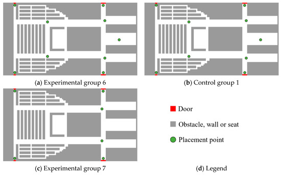 In complex evacuation environments, installing signage at every location is impractical. Excessive signage may result in cognitive overload for passengers and even induce psychological discomfort. Identifying the appropriate number and placement of signage candidate points becomes a critical aspect of layout optimization. Based on the strategy proposed by Wan et al. [37], three typical layout scenarios for signage candidate points are illustrated in Figure 9.