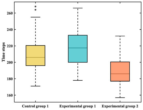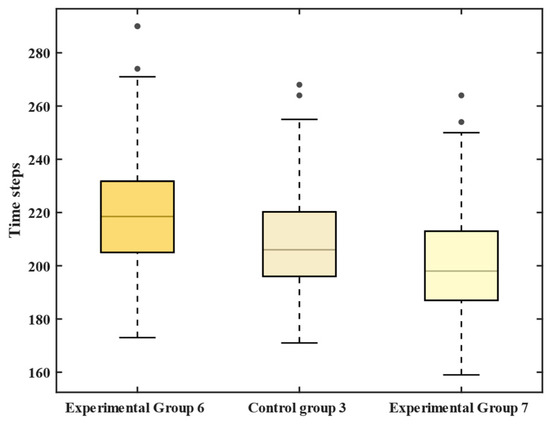 Figure 18 and Table 7 show that the longest time step required for the experimental group 1 to complete the evacuation is 218 steps, followed by 206 steps for the control group 1, and the shortest evacuation time step for the experimental group 2 is 186 steps. These results indicate that a higher proportion of young passengers accelerates overall movement. Although arched congestion appears earlier in this group, it resolves more quickly. Conversely, a higher proportion of elderly passengers reduces the severity of congestion through queuing behavior, but extends the total evacuation time. Compared with Experimental group 2, evacuation duration increased by 5.82% and 17.20% for Control group 1 and Experimental group 1, respectively.
