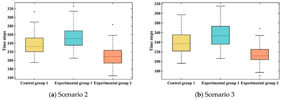 Evacuation time steps of different groups in scenario 2 and scenario 3.
