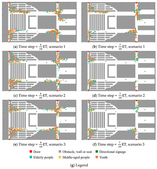 Variations in smoke concentration influence passengers’ visual range and, consequently, evacuation dynamics. This section explores the effects of visual range under three smoke scenarios (Scenario 1, 2, and 3). The analysis focuses on two key time points—ET and ET—which effectively illustrate the progression of evacuation congestion (Figure 20).