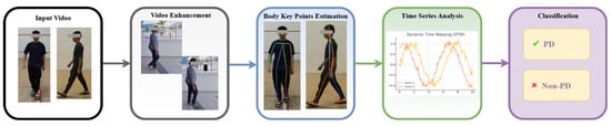 The processes for PD classification and prediction employed in this study are depicted in Figure 1. The workflow includes the following five main components: data collection, video enhancement, body key-point estimation, data processing using time-series analysis, and classification. The system records videos to obtain the required data. Body key points are then taken from the video that was captured. The data that have been preprocessed are used for time-series analysis. Finally, both methods are used in the classification step to differentiate between individuals with PD and healthy individuals.