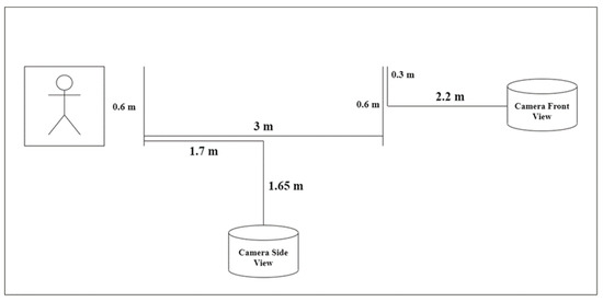 - Data Collection Protocol: The data acquisition setting is depicted in Figure 2. All participants performed the Timed Up and Go (TUG) test [27], a standardized clinical assessment of mobility and fall risk. Participants were instructed to rise from a standard armchair, walk a distance of 3 m at a comfortable pace, turn around, walk back to the chair, and sit down (refer Figure 3). The entire sequence was recorded using a high-quality camera (1080p resolution and 30 frames per second) from both frontal and side perspectives to ensure a comprehensive capture of movement dynamics. Some example captures of the TUG test are illustrated in Figure 4.