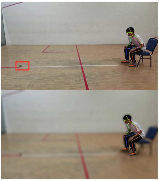 As there is no constraint imposed on the background during the video capturing process, the video may contain noises that may disrupt the subsequent video processing steps. To mitigate this, background subtraction is performed using the PixelLib 1.0 library [29]. This method employs a deep learning-based segmentation model to distinguish the foreground from the background, effectively removing unnecessary elements. Additionally, a Gaussian blur is applied to the background while preserving the clarity of detected individuals in the frames. This approach minimizes background interference, enhancing the accuracy of feature extraction and analysis. The preprocessing time is approximately equal to the duration of the video itself (e.g., a 30 s video takes about 30 s to process). Figure 6 illustrates the improved video output where obstacles or noise on the floor highlighted by the red bounding box have been successfully removed.