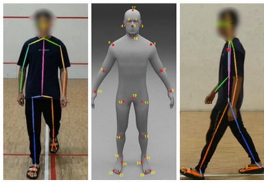 To estimate the participant’s body key point, AlphaPose [30] is applied in this study. AlphaPose is a sophisticated method for estimating and tracking whole-body poses in multi-person scenarios. It excels in real-time, local, and multi-person posture estimation tasks. It is an open-source solution that can produce high mean average precision (mAP) on benchmark datasets, such as COCO. The capabilities of AlphaPose extend to applications in computer vision, human–computer interaction, and other domains that require exact human pose information. This study utilizes the model ZOO trained on the Halpe Full-Body Human Key points and HOI-Det dataset [30] to extract 26 key points related to the body movements, including nose, left eye, right eye, left ear, right ear, left shoulder, right shoulder, left elbow, right elbow, left wrist, right wrist, left hip, right hip, left knee, right knee, left ankle, right ankle, head, neck, hip, left big toe, right big toe, left small toe, right small toe, left heel, and right heel. The application of this model provides more detailed information, particularly in the estimation of foot movements [30]. Figure 7 presents a sample for body key points estimated by AlphaPose.