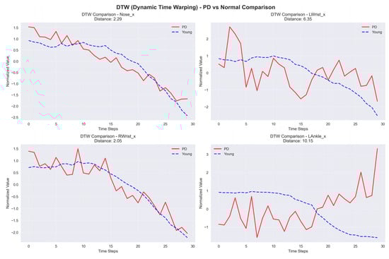 DTW is a robust method for comparing time series that show variation in speed. For example, two time series may have similar overall patterns, but one may have a longer duration than the other. DTW can align the time-series data to obtain a similarity score. This method is especially useful for classification tasks that include challenging temporal alignment. Having this ability is essential in PD classification, as gait speed and rhythm can vary greatly among individuals. The sample graph in Figure 9 shows two time series that may have differences in timing but indicate similar patterns. DTW synchronizes these series in time to calculate a similarity score. DTW is defined by