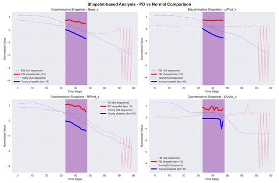 Shapelet-based Classification is a method that detects sub-sequences, known as shapelets, in a time series that accurately indicates the membership of a particular class. This approach identifies the most optimal shapelets that closely fit a given time series to classify it. Within the context of PD, particular patterns or shapes found in gait data can serve as indicators of the disease. Therefore, Shapelet-based Classification is a useful technique for classifying between healthy instances and PD patient. The sample graph in Figure 10 shows a time series with a unique red region that represents a shapelet. The shapelets show membership in a specific class and are used to classify an entire time series. The distance between a shapelet s and time series T is computed as