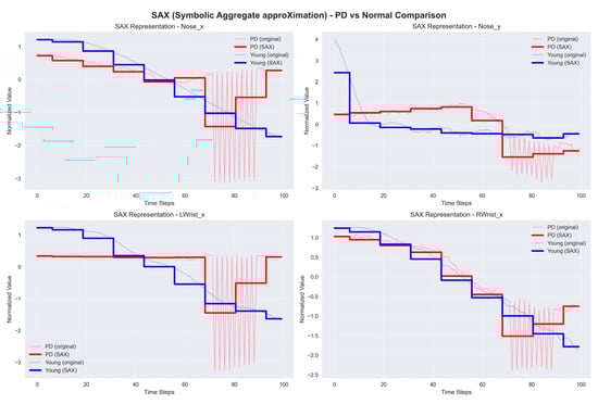 SAX transforms time-series data into symbolic representations, simplifying the application of traditional data mining and machine learning methods for classification. SAX simplifies the data by converting continuous data into discrete symbols, thus reducing complexity while maintaining important patterns. This approach enables fast and accurate classification, allowing for the detection of anomalies in walking patterns associated with PD. The sample graph in Figure 12 shows a time series, where the red dots reflect its SAX representation. SAX transforms the continuous time series into symbolic representations to make analysis easier.