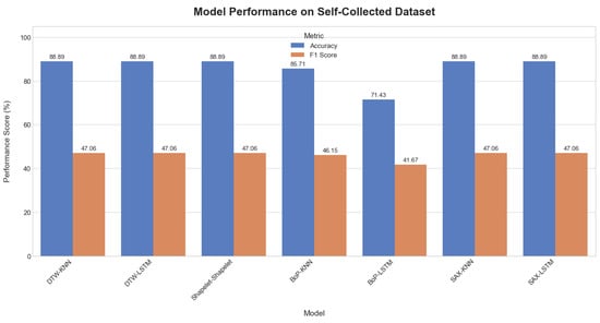 Comparative plot of model accuracy and F1-scores on the self-collected dataset.