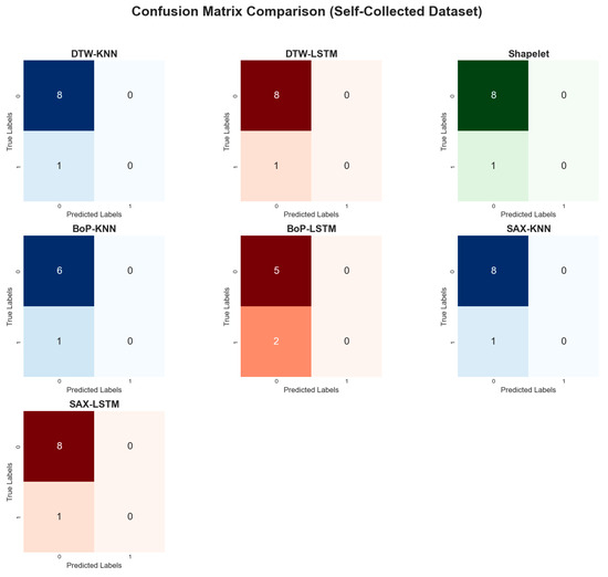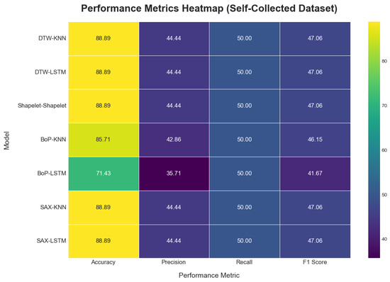 On the self-collected dataset, most models achieved a high accuracy of 88.89%. The performance metrics for all applied methods are summarized in Table 3. The models accuracy plot, performance metrics heatmap and confusion matrix comparisons are depicted in Figure 13, Figure 14, and Figure 15, respectively. While accuracy was consistently high, the precision (44.44%) and recall (50.00%) for the top-performing methods were modest, suggesting potential overfitting or noise in the data. Methods like Dynamic Time Warping (DTW) and Symbolic Aggregate approXimation (SAX) provided equal benefits to both KNN and LSTM classifiers. The Bag-of-Patterns (BoP) method was a notable exception, where KNN (85.71% accuracy) significantly outperformed LSTM (71.43% accuracy). The reduced performance of LSTM with BoP suggests this method may not preserve the temporal sequences that LSTM relies on.
