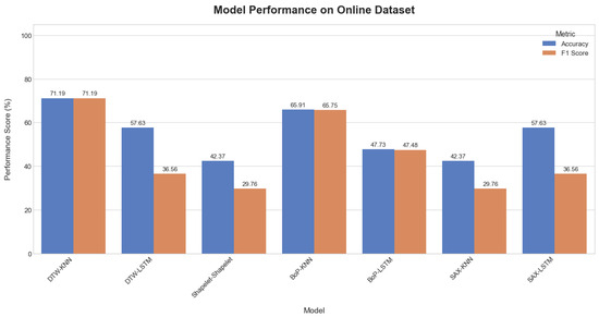 Comparative plot of model accuracy and F1-scores on the online dataset.
