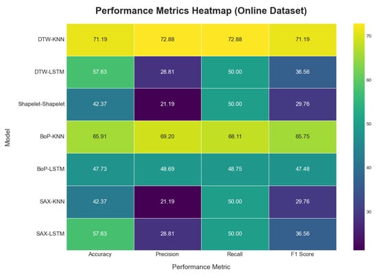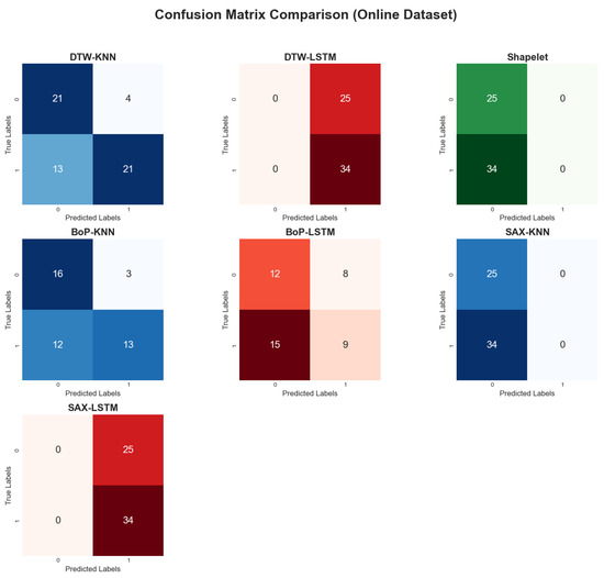 When applied to the online dataset, model performance was generally lower and more varied, as shown in Table 4. The visual representations of the results are provided in Figure 16, Figure 17 and Figure 18. This is likely due to greater complexity, noise, and variability in this dataset compared to the self-collected one. The DTW method with KNN achieved the highest accuracy at 71.19%. In contrast, the Shapelet-based Classification and SAX methods performed poorly, with accuracies of only 42.37%. This suggests that patterns identified by these methods in the self-collected data did not generalize well to the more complex online dataset.