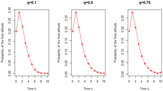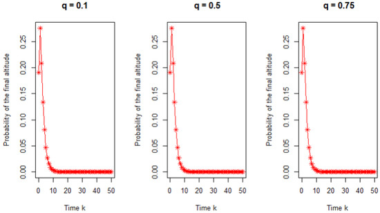 Figure 2 shows that the probability of the final altitude is increasing from 0.1914062 for to attain its maximum 0.2758942 at for the three different values (0.1, 0.5, and 0.75) of , starts decreasing and approach 0 at time , respectively. Also, we observe that the decay rate of the density function of for is quicker than the others (0.5, and 0.75). Finally, we remark that the density function of equals 0 approximately from to for the three values 0.1, 0.5, and 0.75) of . Plus, precisely, the probability equals and is decreasing to , , and from time to 50 for the values (0.1, 0.5, and 0.75) of , respectively.